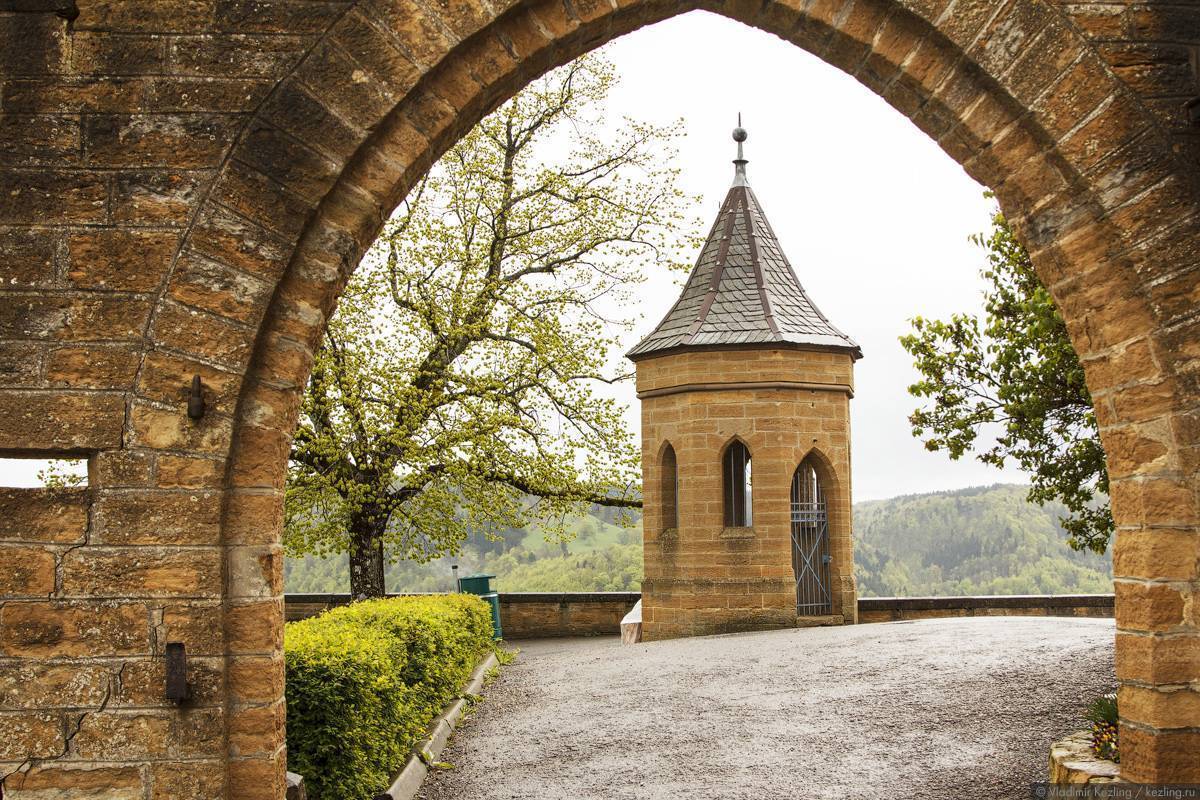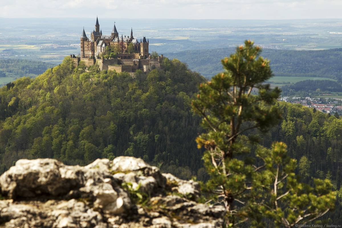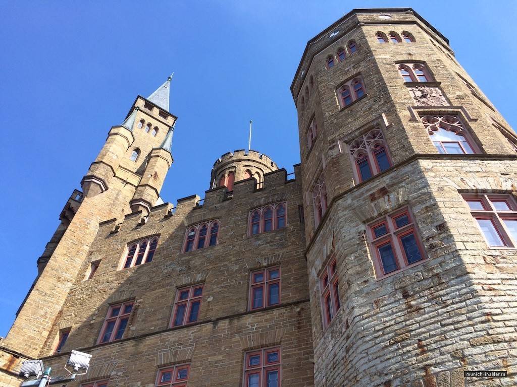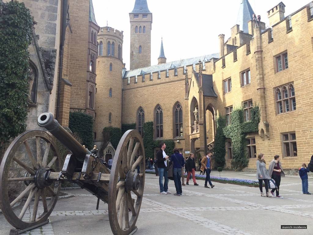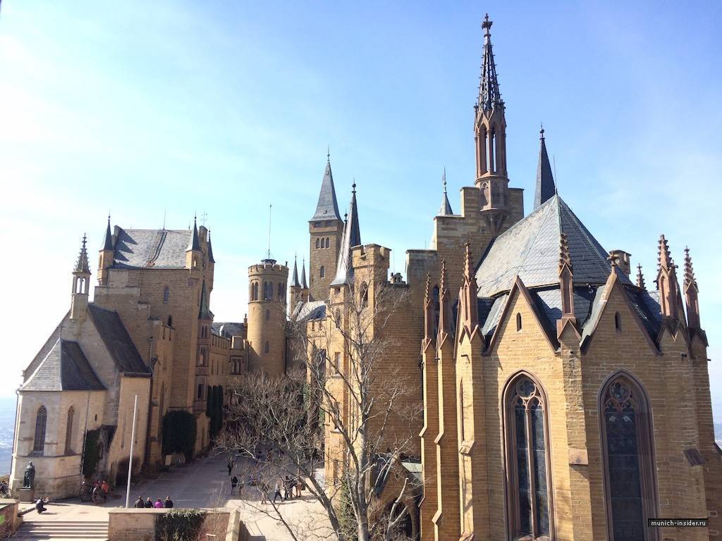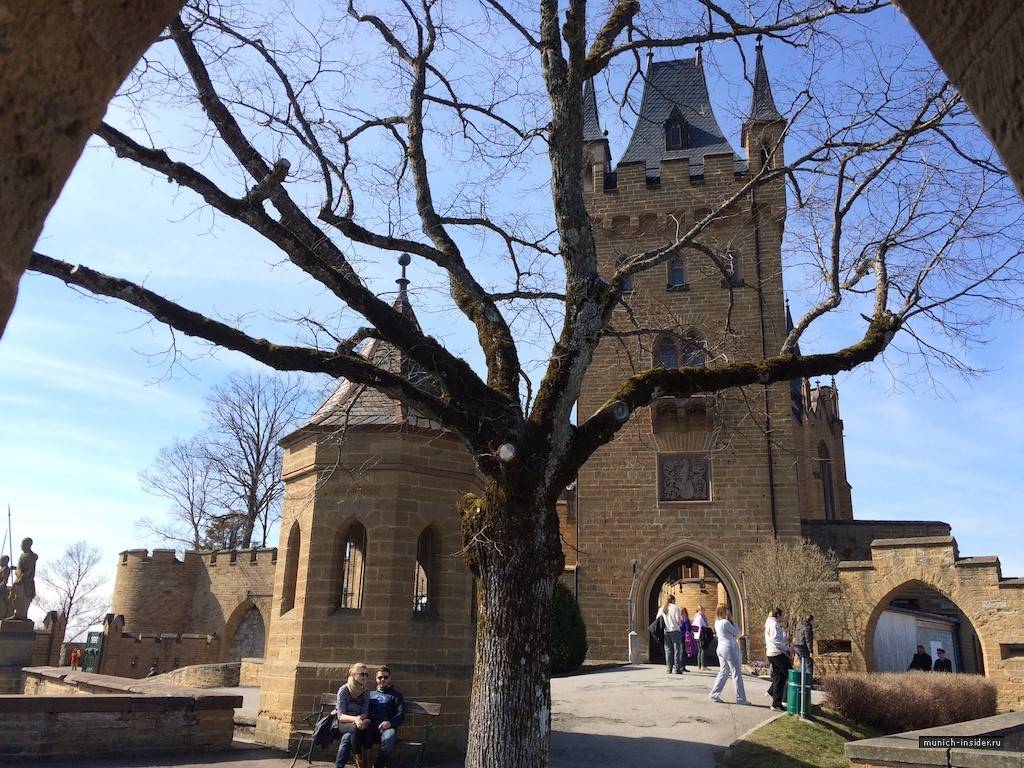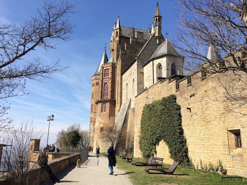 Захватывает дух, открывающийся сверху великолепный вид на окрестности.  Чтобы добраться до замка вам придется взбираться по крутым ступеням. Однако в  это время можно любоваться удивительным лесом, через который лежит путь к архитектурному  сооружению. Попасть в замок и ознакомиться с историей династии Гогенцоллернов  можно через часовню. Экскурсия, которая знакомит с внутренней частью замка,  длится всего 30 минут. У входа в замок, можно попробовать знаменитое немецкое  пиво, которое вам предложат в пивном дворике, окруженном удивительно красивым  садом. Здесь же вы заметите постройки, которые выглядят значительно старше  остальных. Действительно, они не были разрушены осадами и войнами и сохранены в  первозданном виде во время реконструкций замка.