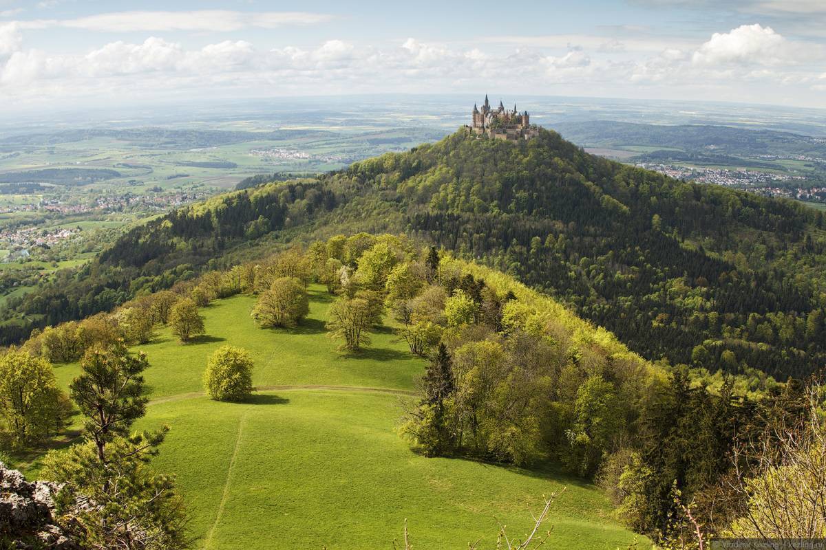 Недалеко от  Тюбингена над рекой Цоллерн возвышается живописный холм, увенчанный старинным  замком. Замок Гогенцоллерн немцы и  многочисленные туристы называют «замком в облаках». Этот замок действительно  поражает своей неестественной красотой. Расположен он на самой вершине Швабских  Альб – одноименной горе, которая возвышается над уровнем моря более чем на 800  метров. Великолепный замок повторяет контур горы и кажется неотъемлемой частью  пейзажа – настолько органично он в него вписывается.