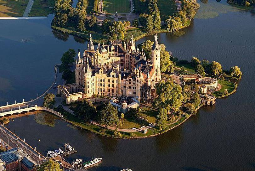 Находится на острове рядом с озером Шверин. На протяжении веков дворец был домом великих князей Мекленбургских. Замок считается одним из самых важных объектов романтической архитектуры в Европе и является объектом Всемирного наследия.