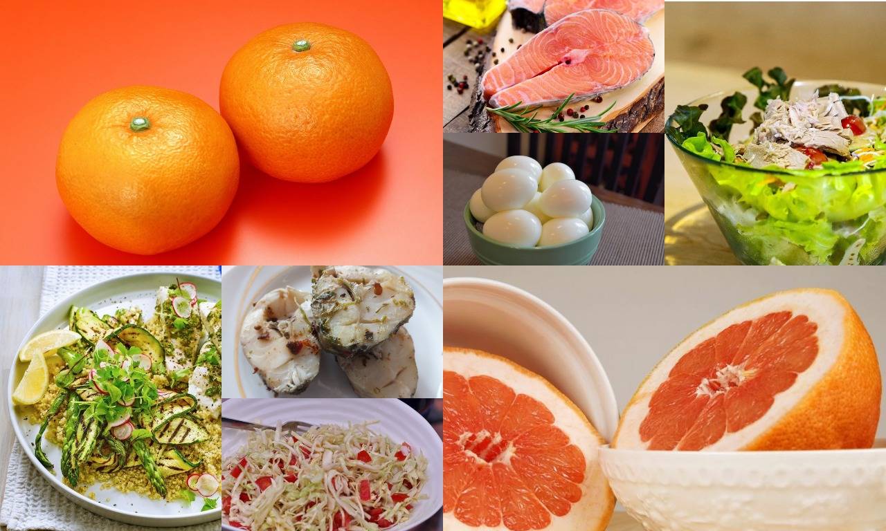 - салаты из фруктов: киви, апельсин, мандарин, 1/3 яблока и грейпфрута, 10 ягод винограда и ядро любого, желательно грецкого, ореха.